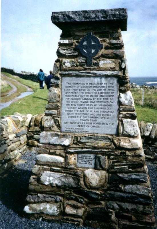 The ship Exmouth, captained by Isaac Booth of Sunderland, left Londonderry bound for Quebec on the morning of Sunday 25th April 1847. The exact number of passengers has never been accurately established. Though the vessel was registered to carry 165 and a half people (two children counted as one adult) it is believed that the actual number on board exceeded 240. These were almost exclusively emigrants fleeing the Irish famine and seeking a better life in Canada.